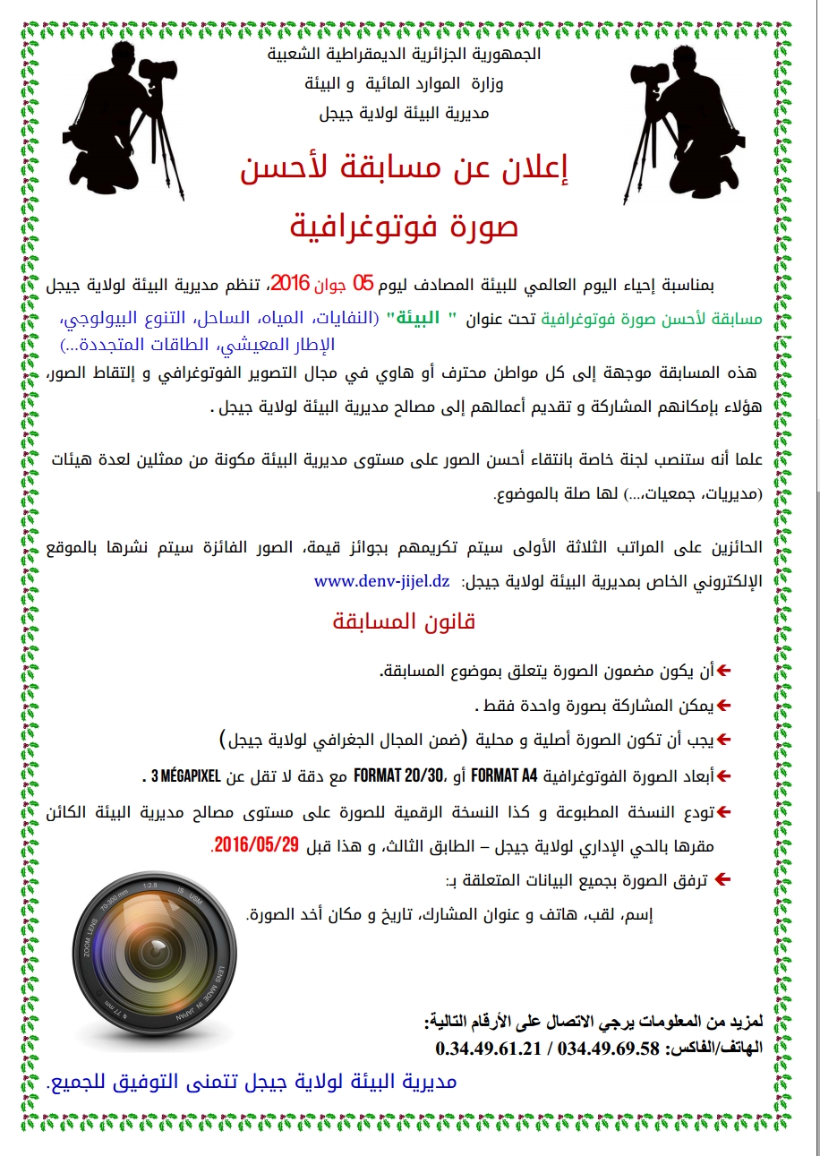 بمناسبة إحياء اليوم العالمي للبيئة المصادف ليوم 05 جوان 2016، تنظم مديرية البيئة لولاية جيجل مسابقة لأحسن صورة فوتوغرافية تحت عنوان