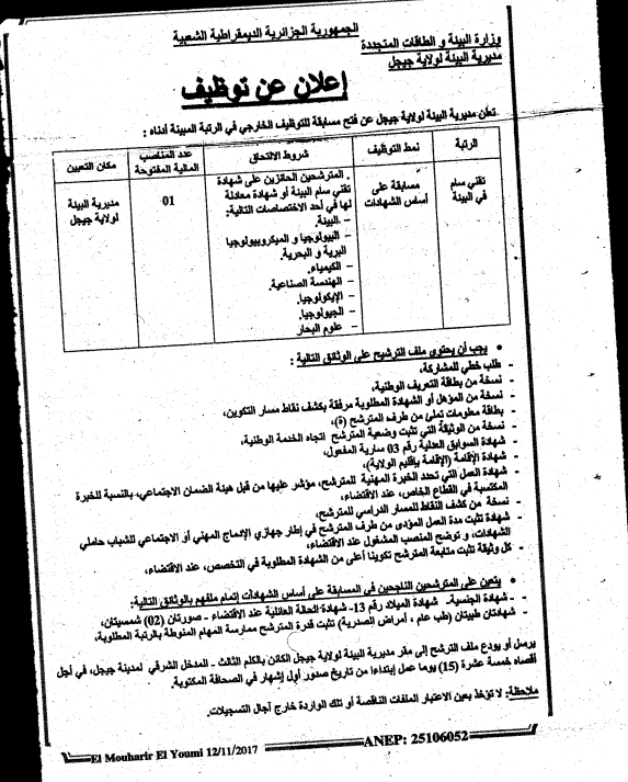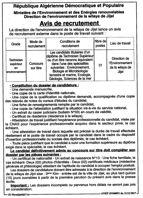 مسابقة التوظيف 2017 تعلن مديرية البيئة لولاية جيجل عن فتح مسابقة التوظيف الخارجي الخاصة برتبة تقني سامي في البيئة.
