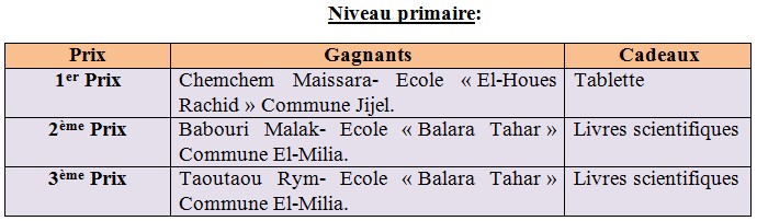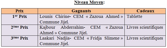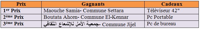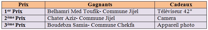 Organisation d’une cérémonie officielle de remise des prix le 05 Juin 2014 au niveau de la Maison de jeunes « Bounab Rachid » - Commune Jijel, qui consiste à honorer les trois (03) premiers candidats de chaque concours qui ont été lancés par la Direction de l’Environnement à travers tout le territoire de la wilaya de Jijel: