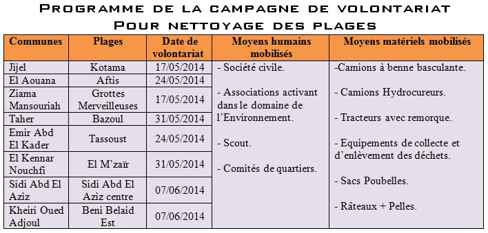 Organisation d’une campagne de volontariat pour nettoyage de quelques plages autorisées et ouvertes à la baignade, les plus fréquentées par les estivants et touchées par la prolifération des déchets (08 plages), à partir du 17 Mai 2014 au 07 Juin 2014, avec la participation de : la Société civile, Associations, Comités de quartiers, Scouts, Clubs verts, Elèves, Office national d’assainissement, Tacherons « Blanche Algérie », Travaux publics, Entreprise de wilaya de gestion des CETs, Direction de la Formation Professionnelle,…etc, avec distribution de T-shirts, casquettes et Dépliants, selon le tableau suivant :