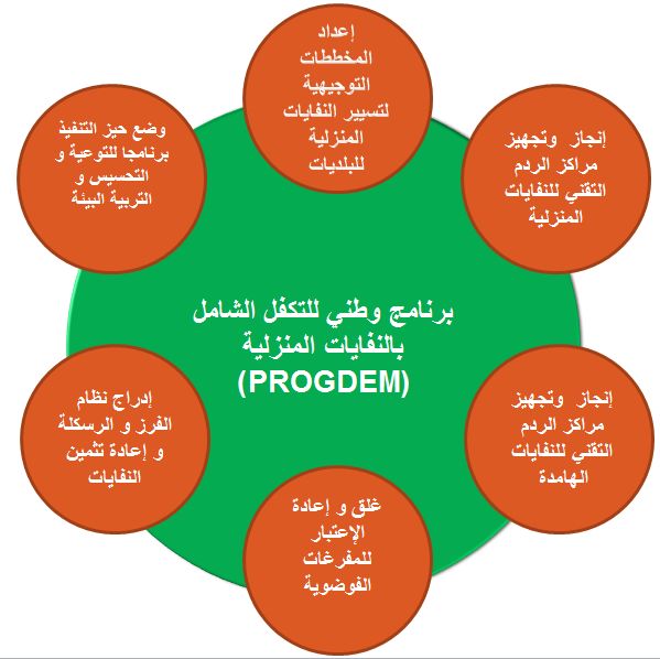 و لمواجهة هذا المحور الذي يشكل أحد أبرز الإنشغالات في الواقع المعاش للمواطن، تم وضع برنامج وطني للتكفل الشامل بالنفايات المنزلية (PROGDEM) لاسيما منذ صدور القانون رقم 01-19 المؤرخ في 12/12/2001 و المتعلق بتسيير النفايات و مراقبتها و ازالتها حيث يتكفل هذا البرنامج بما يلي